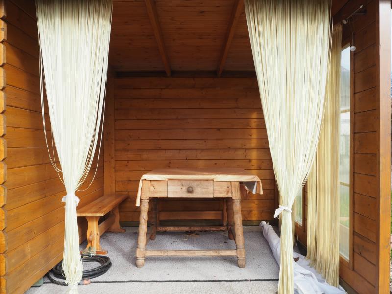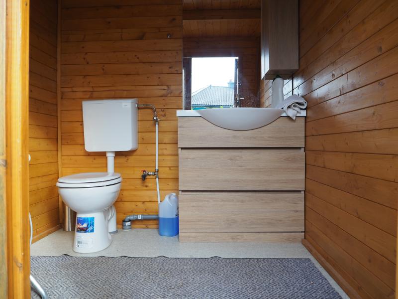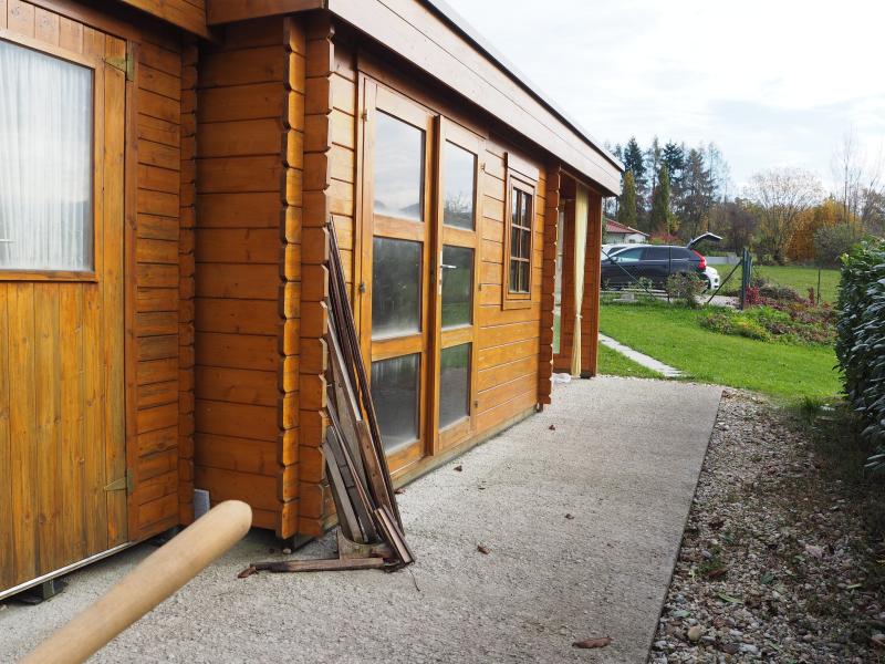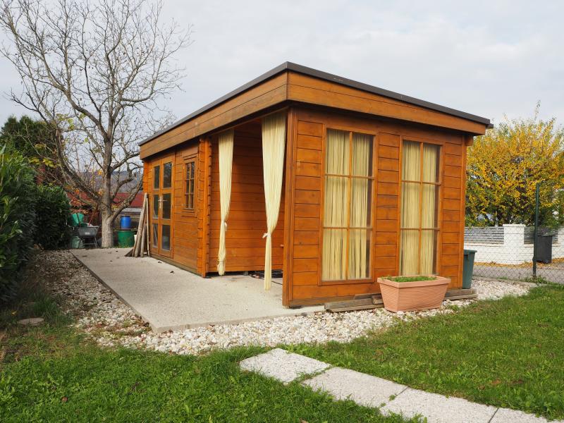 Das Gartenhaus ist eingeteilt in einen Lagerraum; ein WC mit Waschbecken inkl. Kanalanschluß und einen überdachten Sitzplatz.